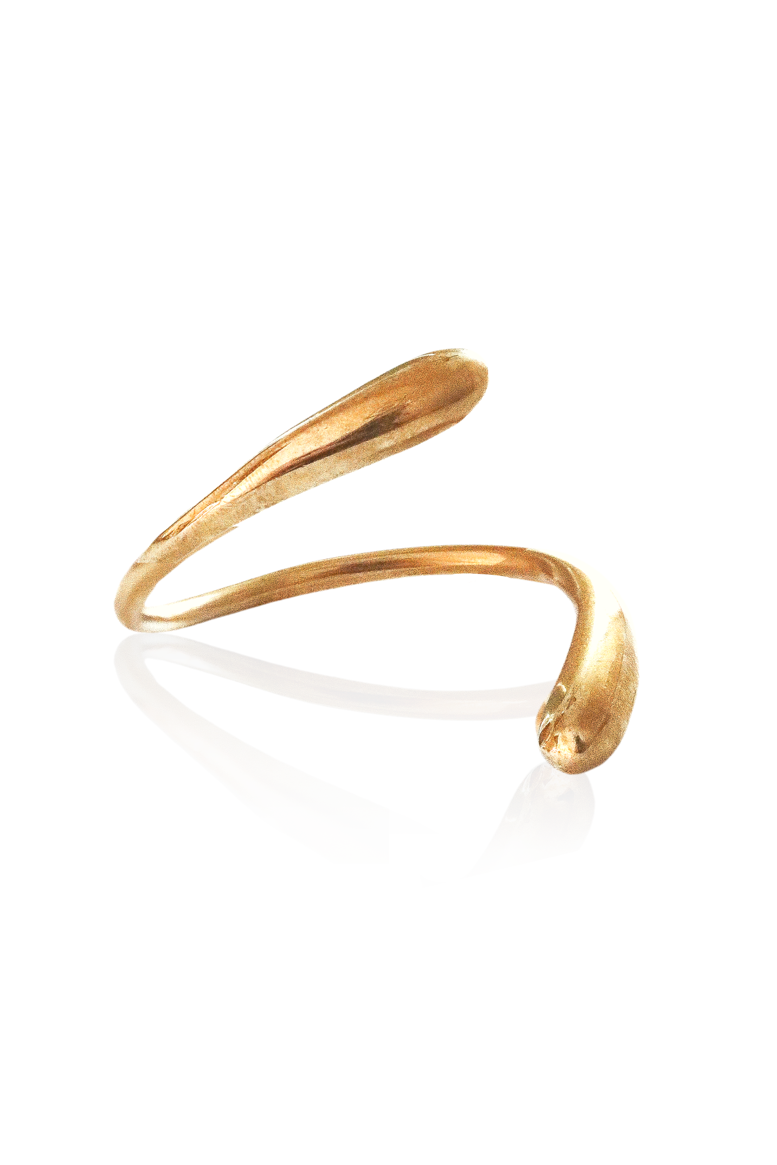 This design features a twisted Brass bangle shaped into a spiral with domes on each end.
